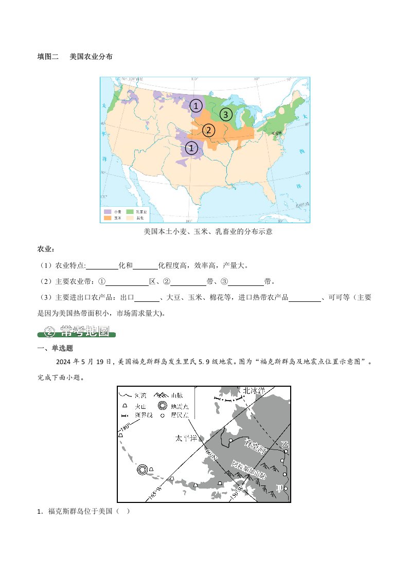 七下地理 10.1 美国(填图速记)-(人教版)(含答案)QXDLRJ-0063