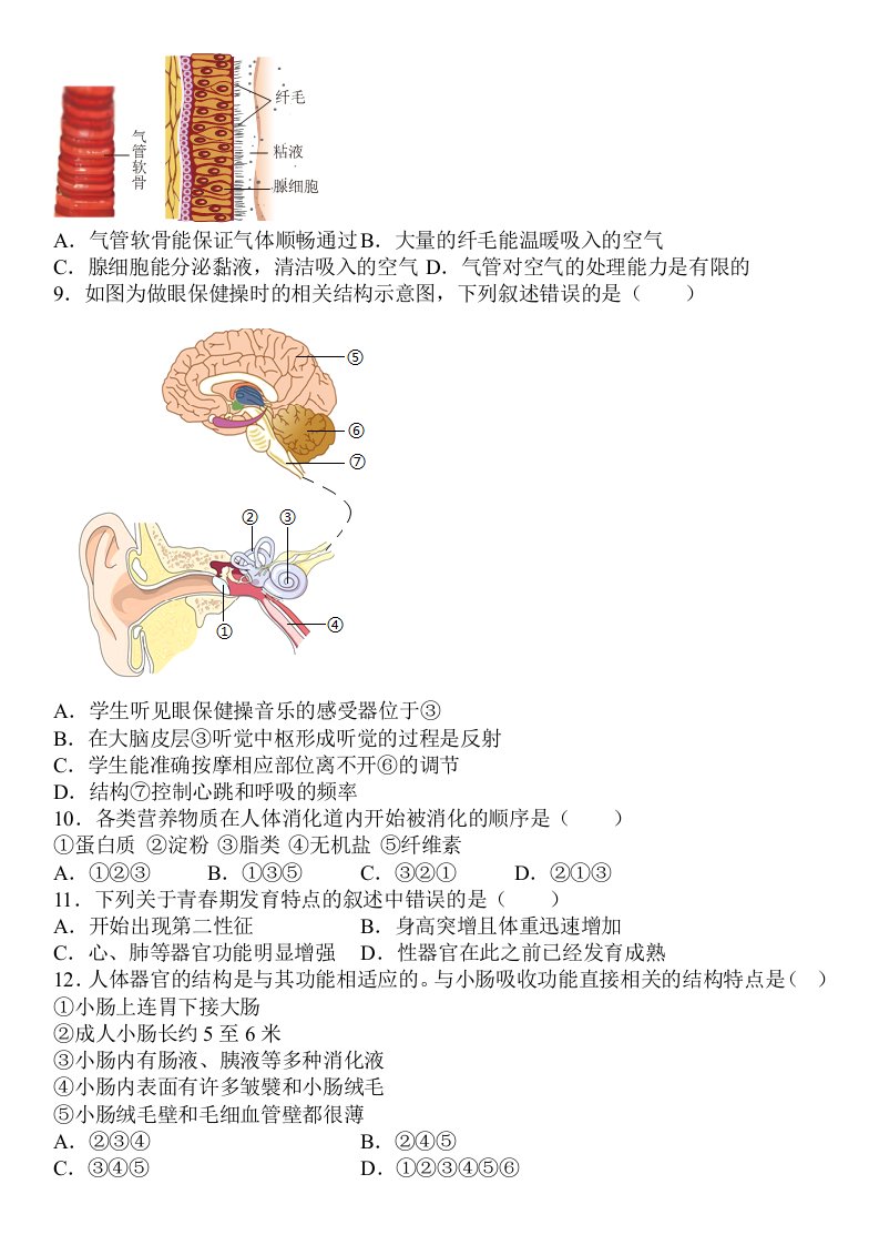 > 初中生物冀少版七年级下册复习练习卷六(含答案)QXSWJS-0252
