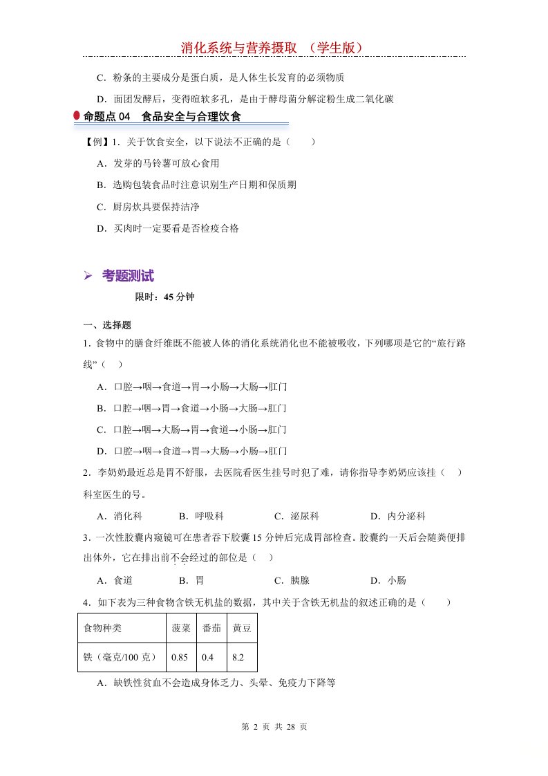 七年级下冀少 生物【专项练习】专题01 消化系统与营养摄取QXSWJS-0231