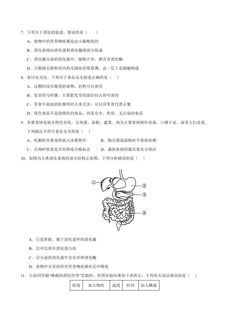 > 七下冀少生物 第一章 消化系统与营养摄取(单元卷·测试卷)(含答案)QXSWJS-0136