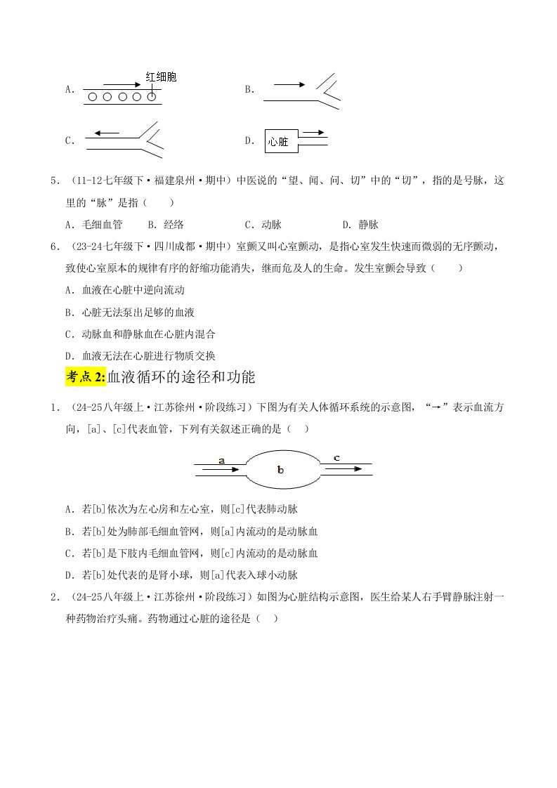 七下冀少生物 第二章 循环系统与物质运输(单元卷·考点卷)(3大考点)(含答案)QXSWJS-0152