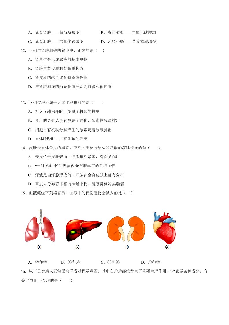 > 七下生物冀少 第四章 泌尿系统与废物排出 (章末复习综合测试卷)(含答案)QXSWJS-0120