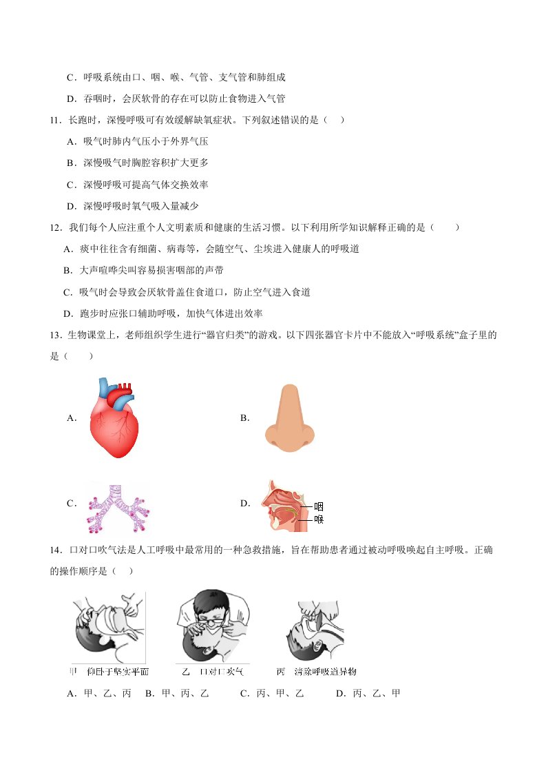 七下生物冀少 第三章 呼吸系统与气体交换 (章末复习综合测试卷)(含答案)QXSWJS-0118