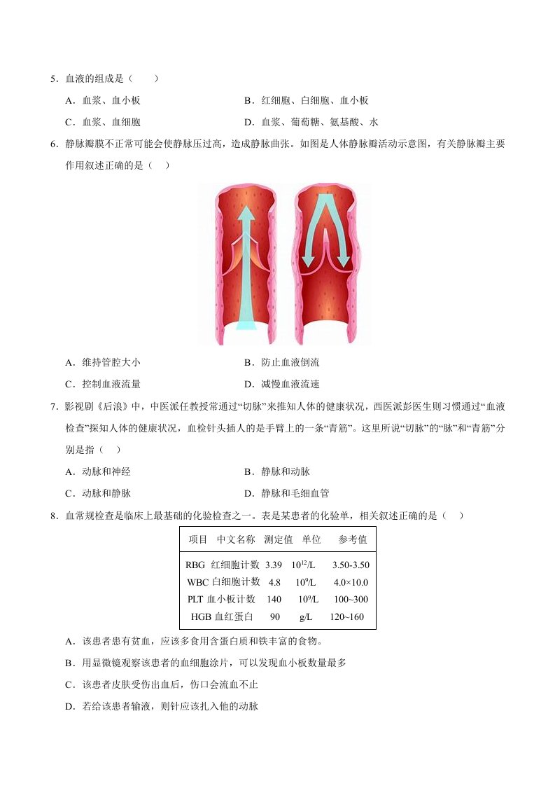 七下冀少生物 第二章 循环系统与物质运输(单元卷·测试卷)(含答案)QXSWJS-0129