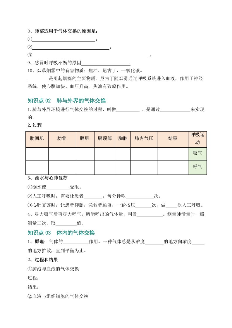 七下生物冀少 第三章 呼吸系统与气体交换(知识清单)(含答案)QXSWJS-0041