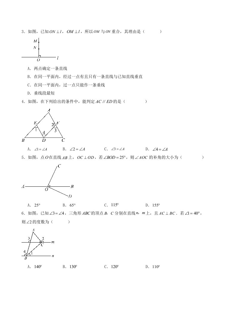 七下数学第1章 相交线与平行线 单元测试(含答案)-(浙教版2024新教材)QXSXZJ-0019