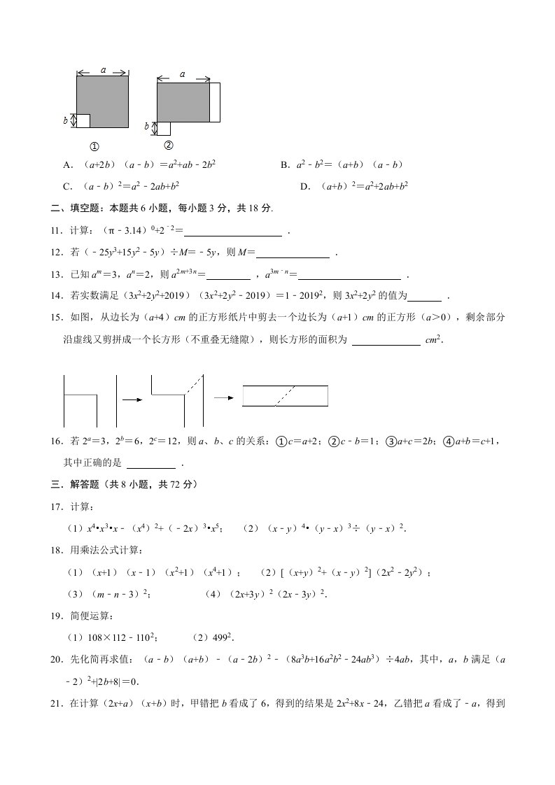 > 七下数学 第3章 整式的乘除 单元检测(A卷·夯实基础)-(浙教版)(含答案)QXSXZJ-0036