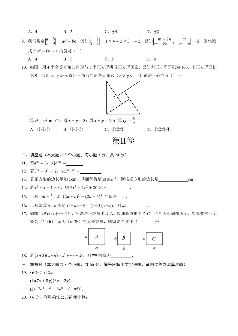 > 七年级数学月考卷【测试范围:湘教版七年级下册第1章】(含答案)QXSXXJ-0206