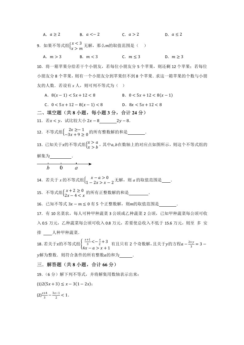 七下数学湘教 第3章 一元一次不等式(组)单元测试卷(含答案)QXSXXJ-0073