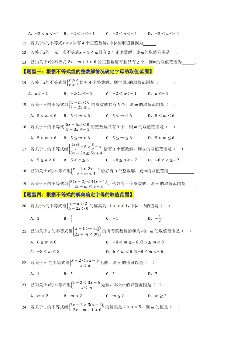 > 七下数学苏科 专题06 不等式(组)中参数的重难点汇编(五大题型)(含答案)QXSXSK-0147