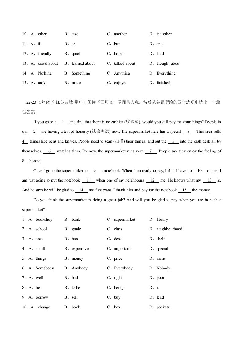 > 七下英语 完形填空(15空)12篇-(译林版)(含答案)QXYYYL-0502