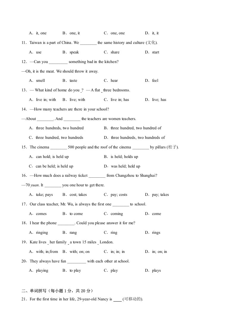 > 七下英语Unit 1词法句法过关练-(译林版)(含答案)QXYYYL-0230