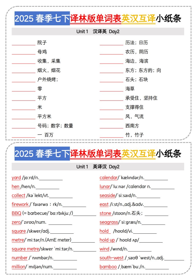 > 06-七下英语译林版单词表英汉互译小纸条QXYYYL-0041