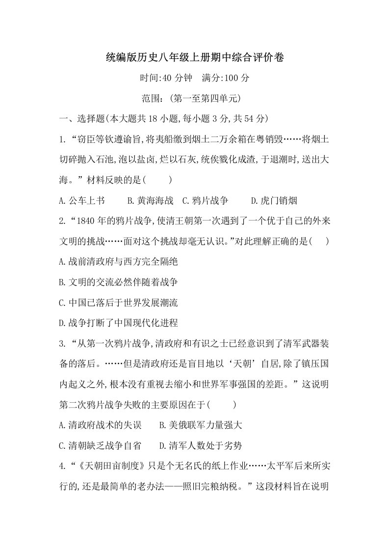 > 统编版历史八年级上册期中综合评价卷(第一至第四单元)(含答案)BSLSTY-0115