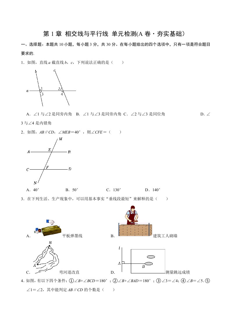 七下数学 第1章 相交线与平行线 单元检测(A卷·夯实基础)-(浙教版)(含答案)QXSXZJ-0032
