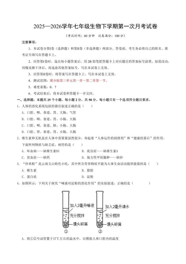 七年级下册生物月考卷【测试范围:前2章】(考试版)(冀少版)QXSWJS-0170