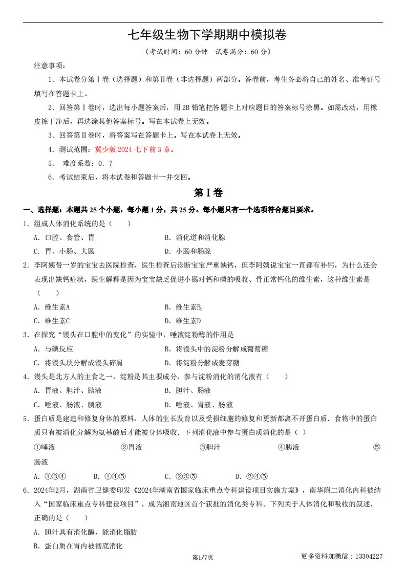 【冀少版】七下生物期中模拟卷QXSWJS-0181