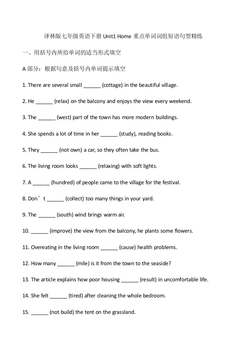 七下译林英语Unit1 Home重点单词词组短语句型精练QXYYYL-0065