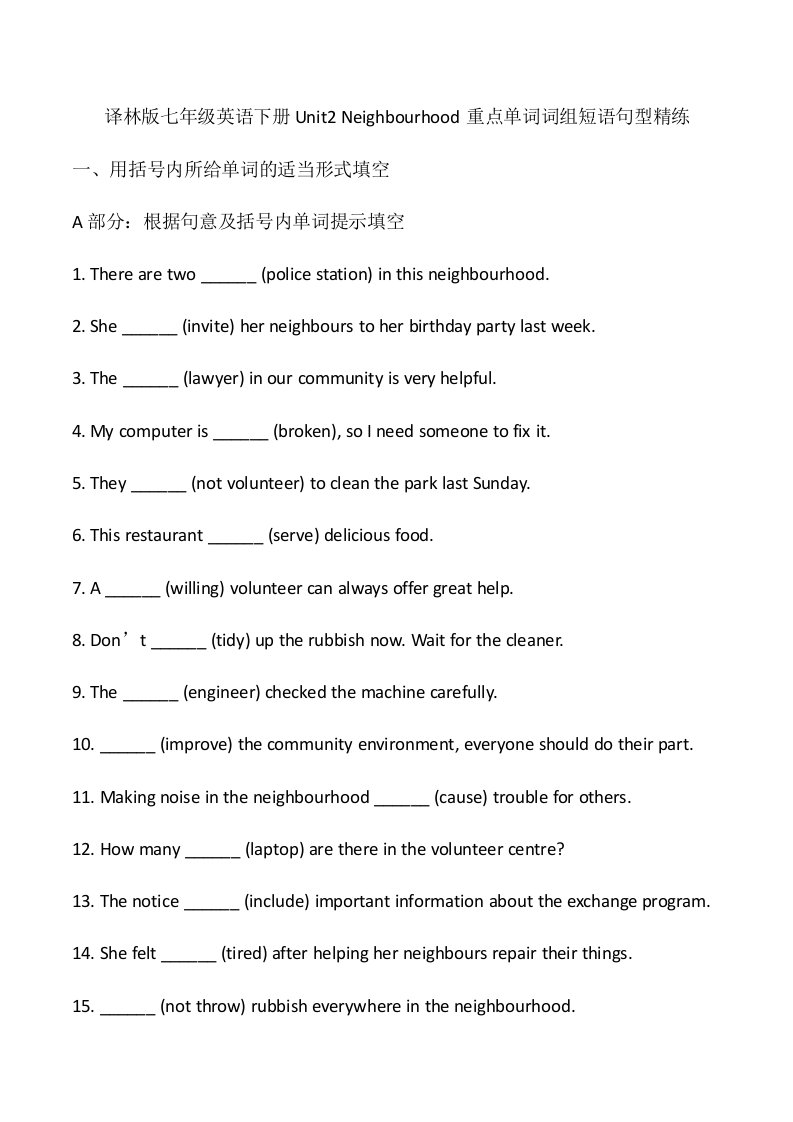 七下译林英语Unit2 Neighbourhood重点单词词组短语句型精练QXYYYL-0066