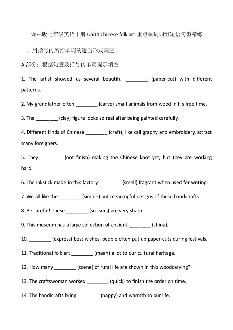 七下译林英语Unit4 Chinese folk art重点单词词组短语句型精练QXYYYL-0068