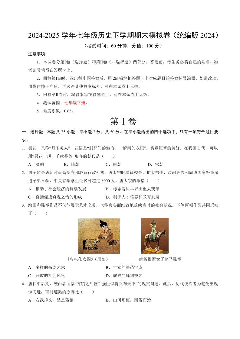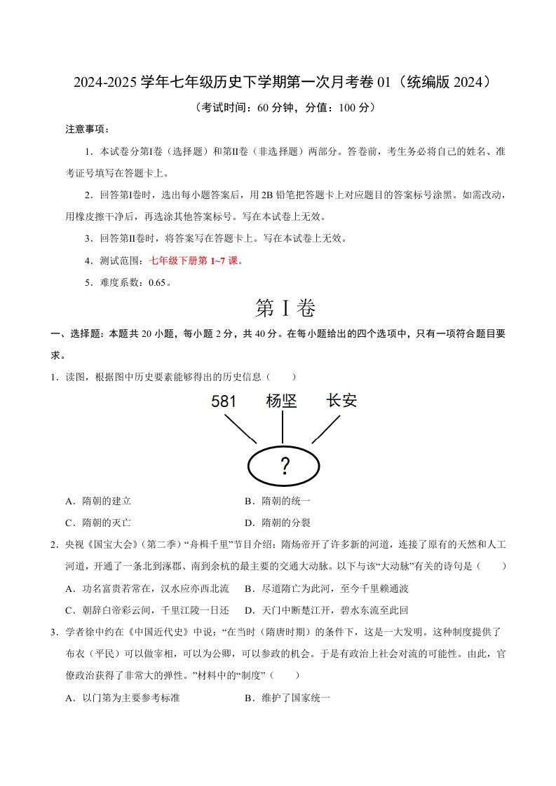 七年级历史月考卷01(考试版)【范围:新七下1~7课】(含答案)QXLSBB-0042