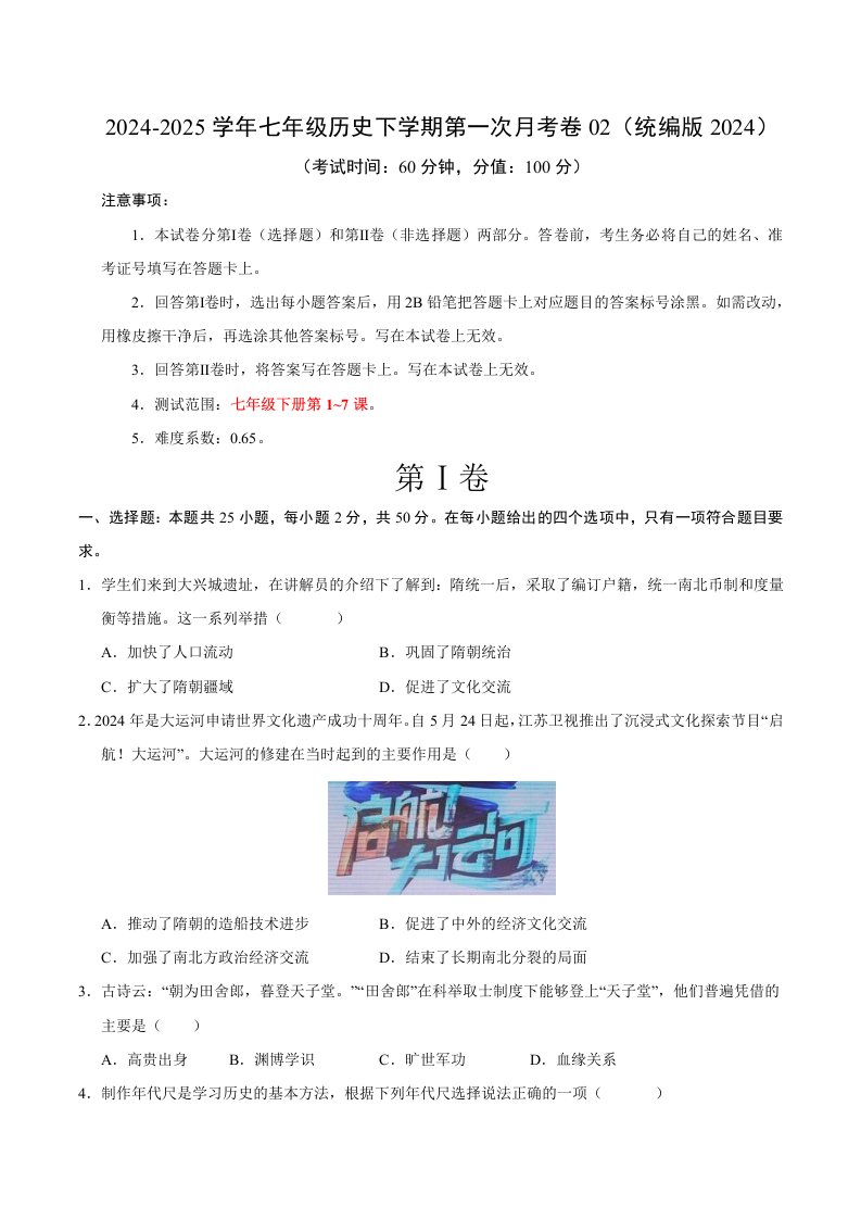 七年级历史月考卷02(考试版)【范围:新七下1~7课】(含答案)QXLSBB-0047