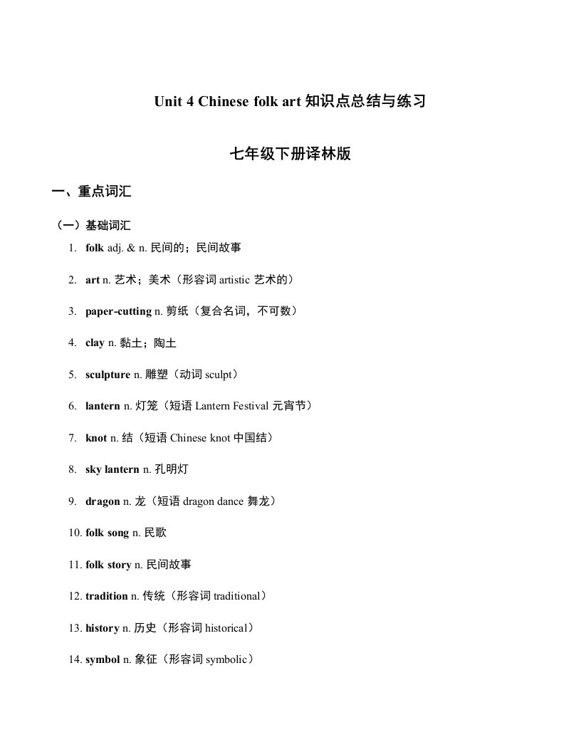 七下英语译林Unit 4 Chinese folk art 知识点总结与练习 QXYYYL-0183