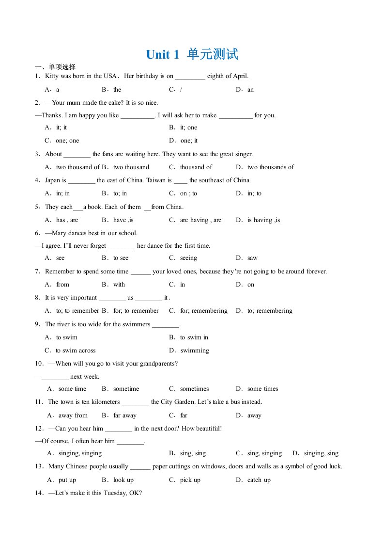 七下英语译林Unit 1 单元测试(含答案)QXYYYL-0211