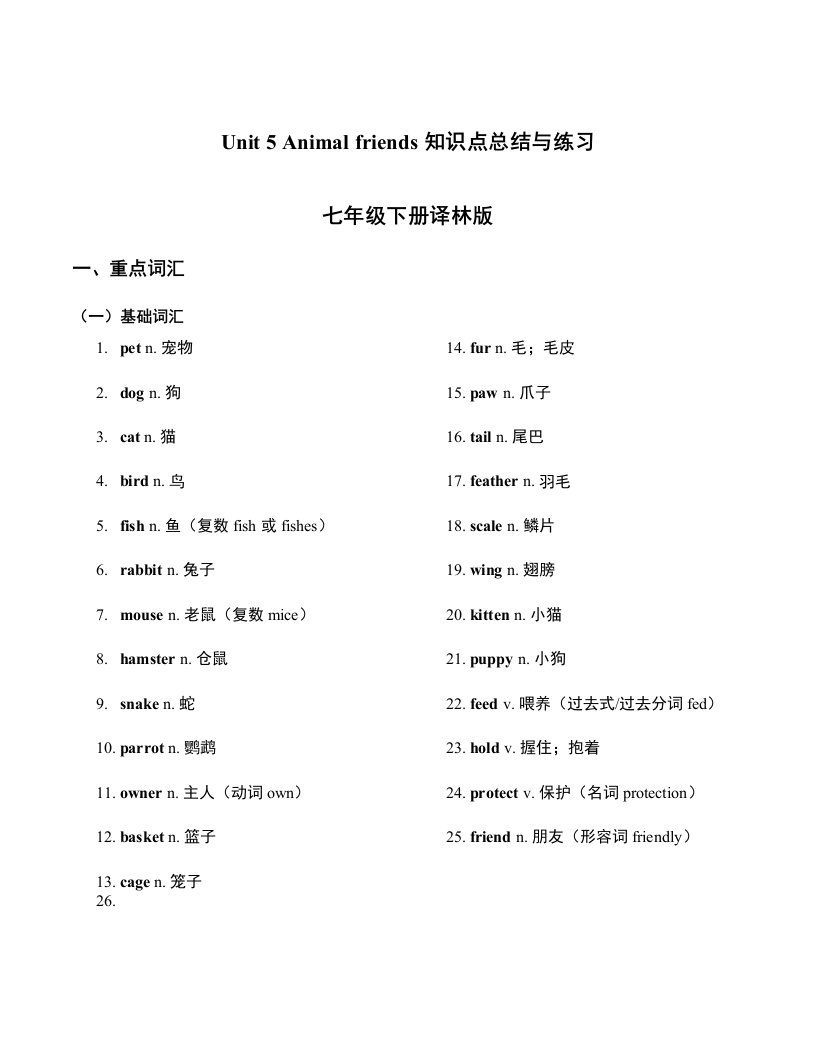 七下英语译林Unit 5 Animal friends 知识点总结与练习 QXYYYL-0184