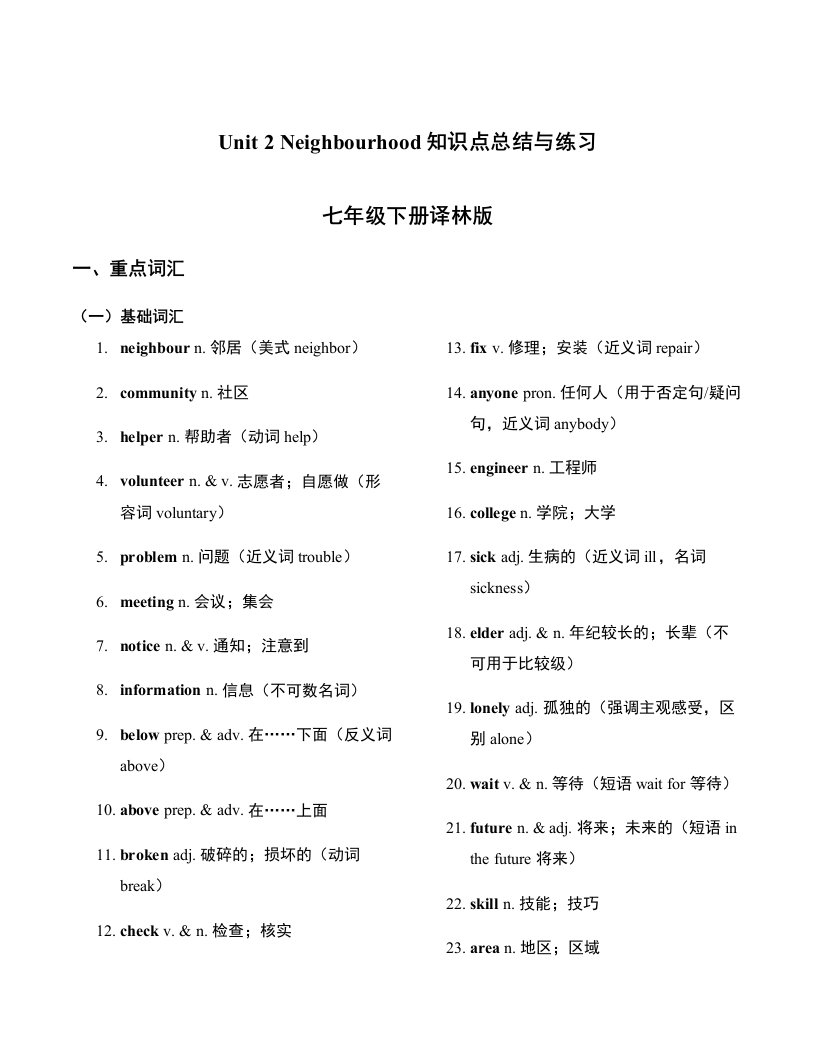七下英语译林Unit 2 Neighbourhood 知识点总结与练习 QXYYYL-0181
