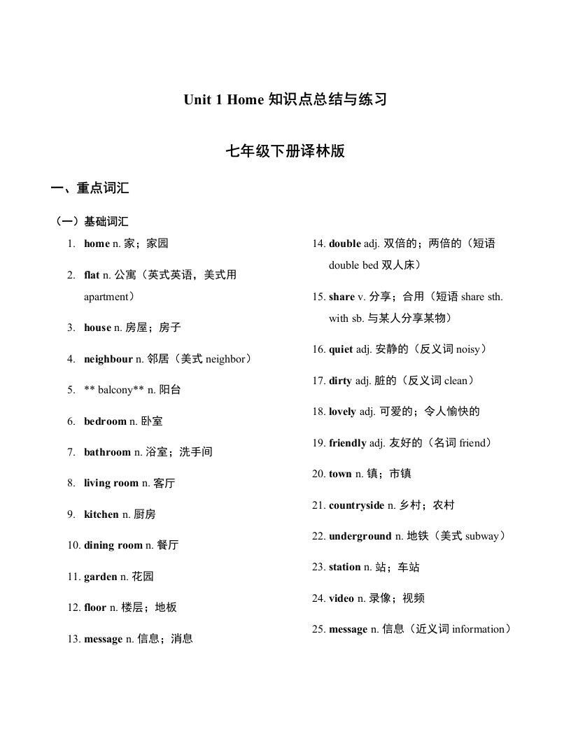 七下英语译林Unit 1 Home 知识点总结与练习 QXYYYL-0180