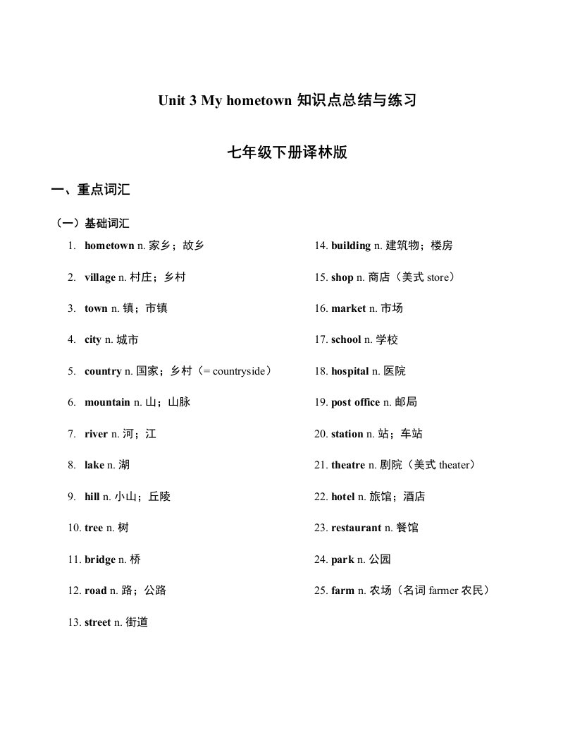 七下英语译林Unit 3 My hometown 知识点总结与练习 QXYYYL-0182