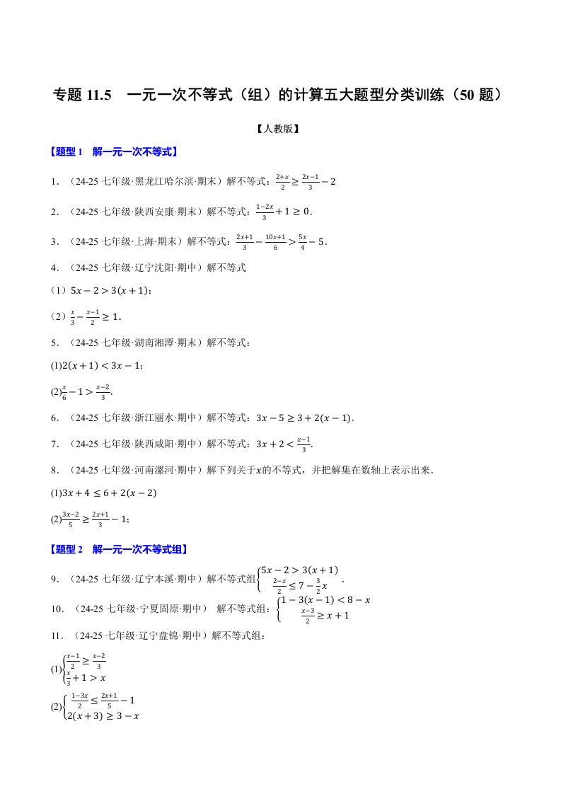 七下数学专题11.5 一元一次不等式(组)的计算五大题型分类训练(50题)(人教版)(含答案)QXSXRJ-0090