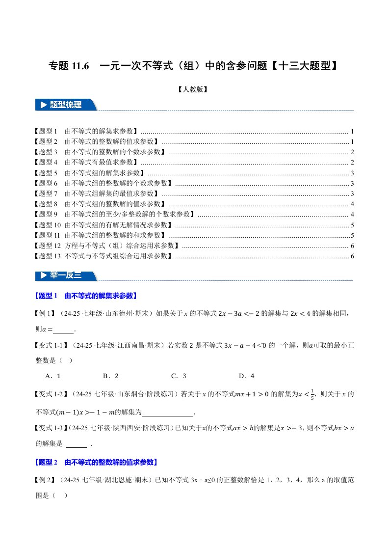 七下数学专题11.6 一元一次不等式(组)中的含参问题(十三大题型)(人教版)(含答案)QXSXRJ-0092