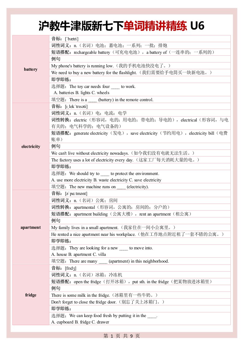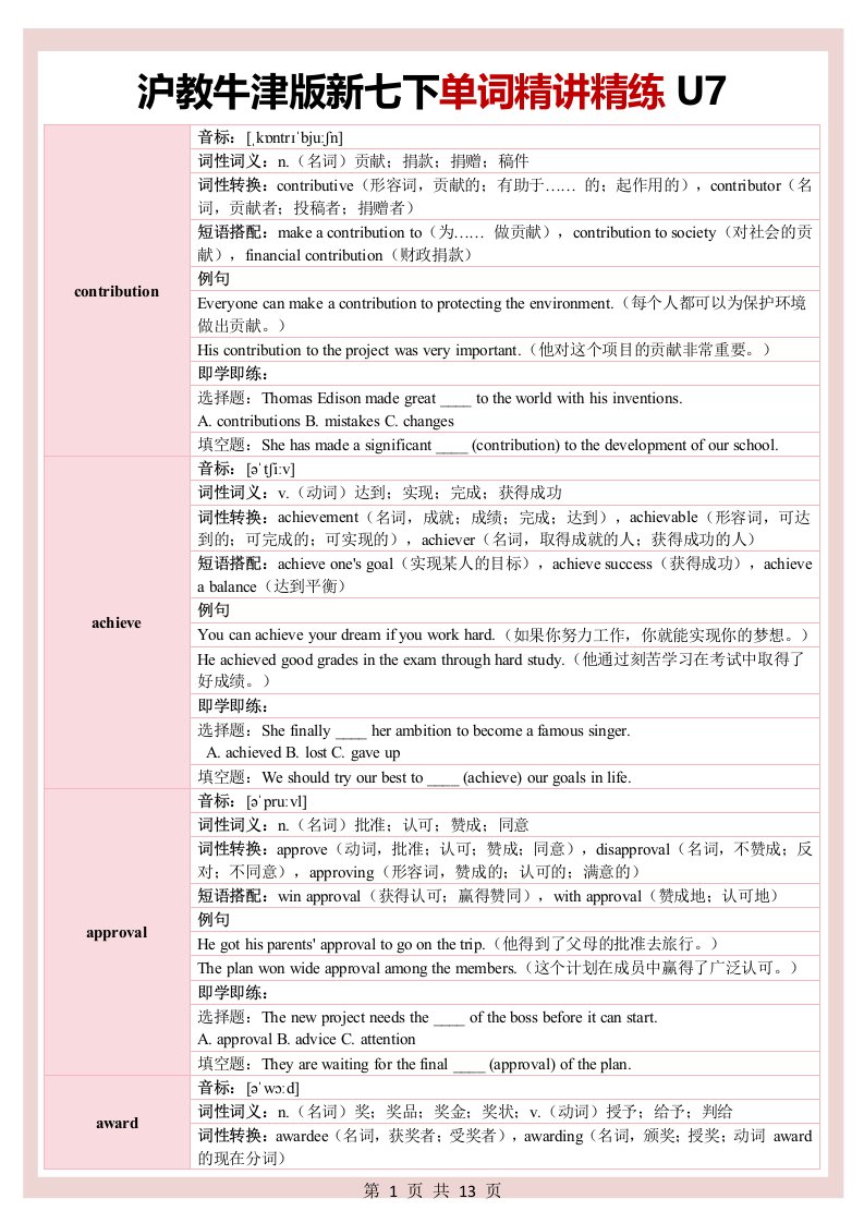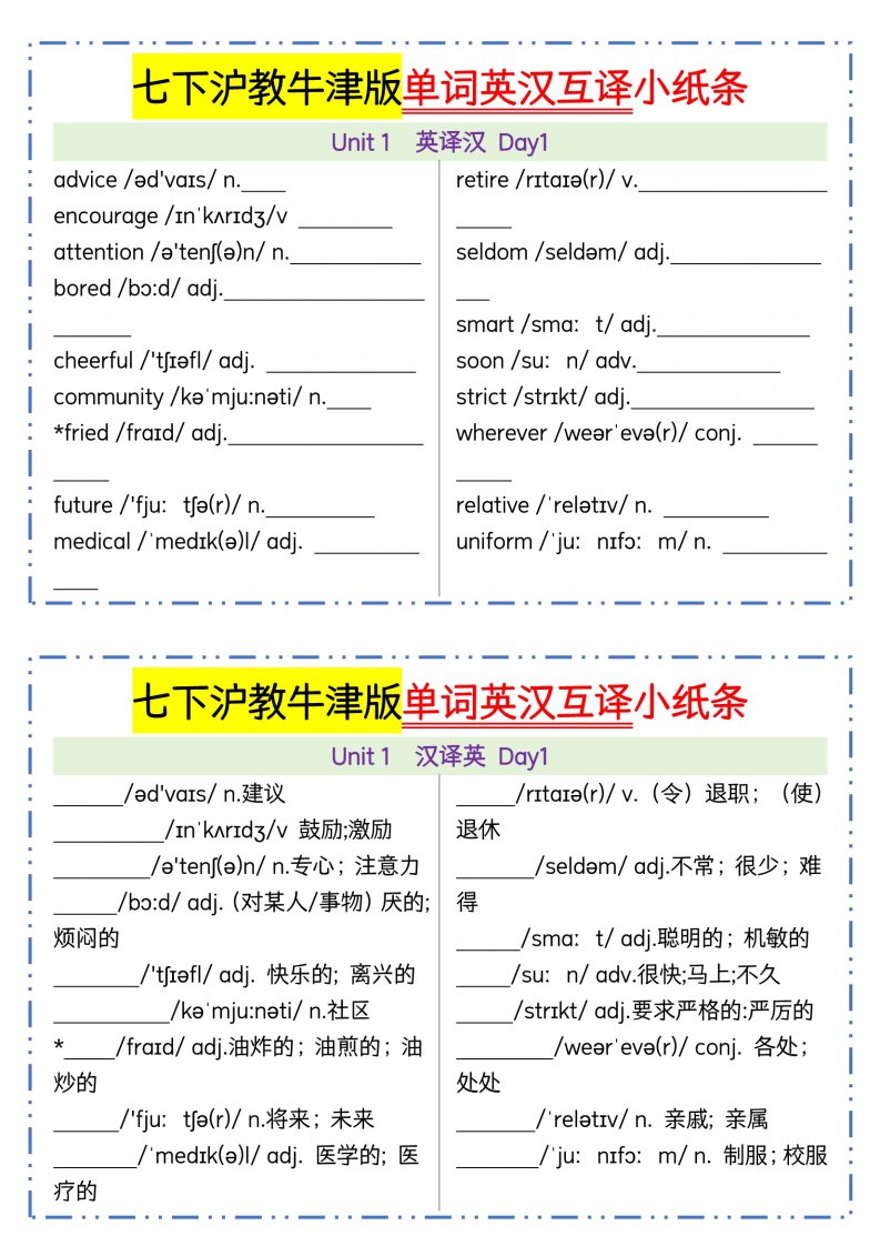 新七下英语沪教牛津 单词精讲精练U1(含答案)QXYYHJ-0065