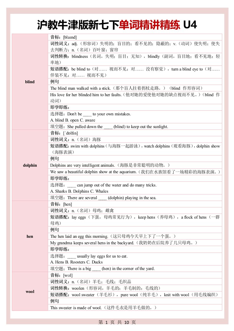 新七下英语沪教牛津 单词精讲精练U4(含答案)QXYYHJ-0071