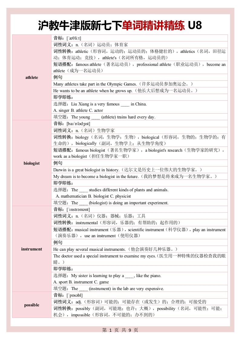 新七下英语沪教牛津 单词精讲精练U8(含答案)QXYYHJ-0079