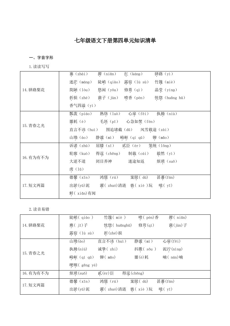 七下语文第四单元(单元知识清单)-(统编版)