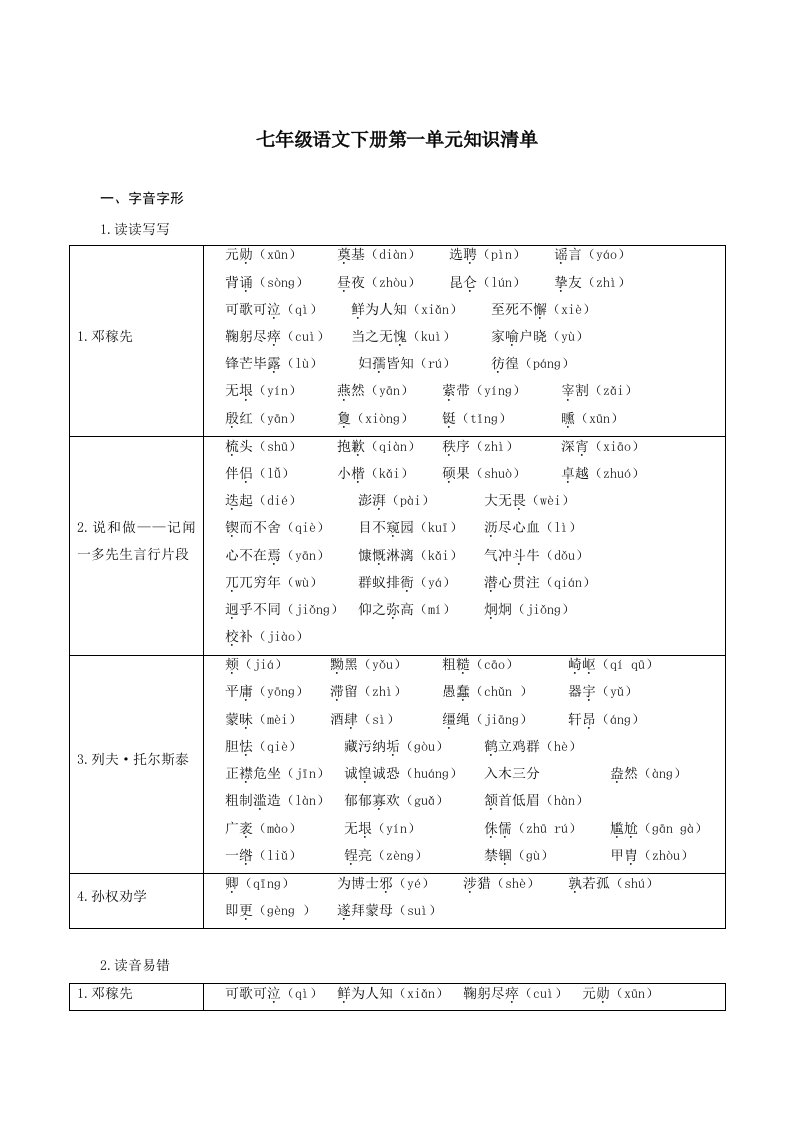 七下语文第一单元(单元知识清单)-(统编版)