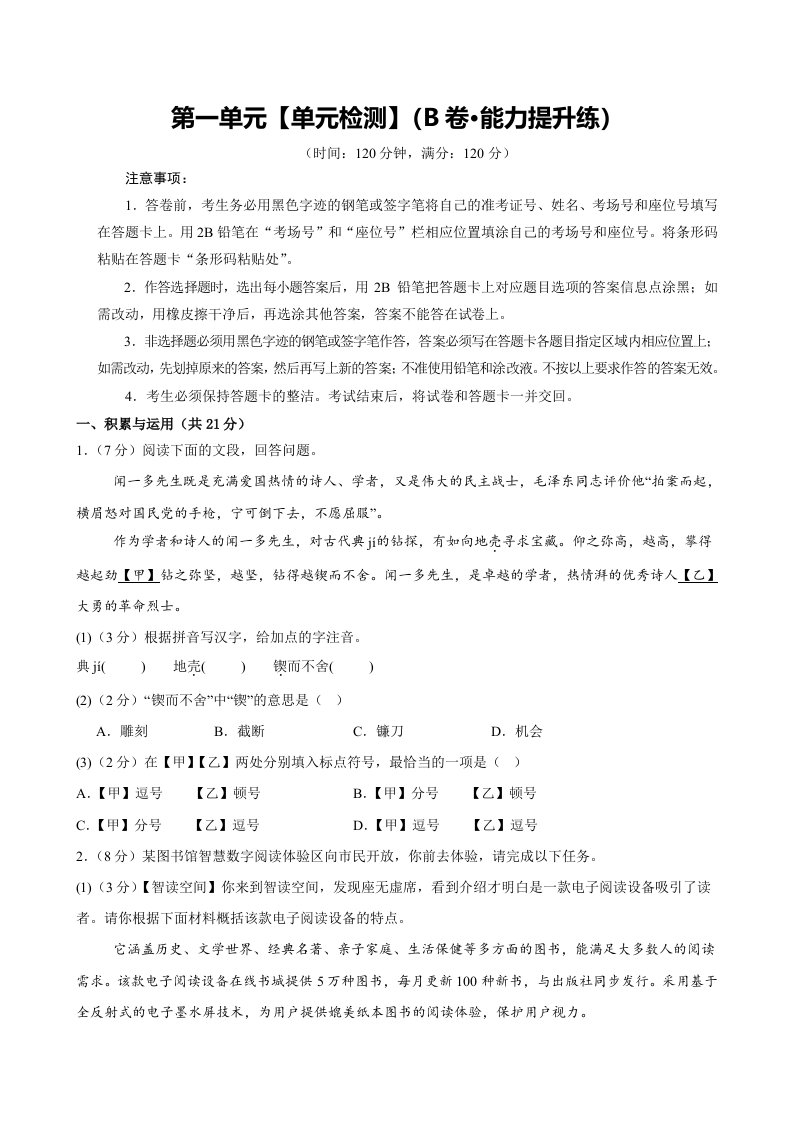 第一单元(单元检测)(B卷•能力提升练)(学生版)(含答案)QXYWBB-0126