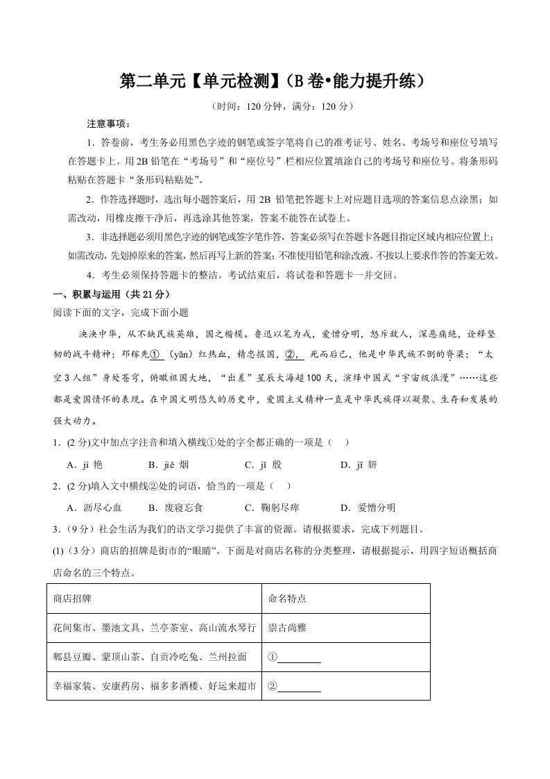 第二单元(单元检测)(B卷•能力提升练)(学生版)(含答案)QXYWBB-0130