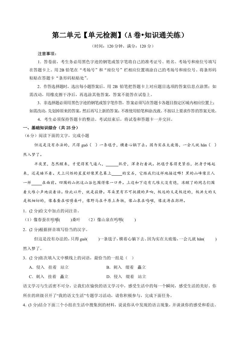 第二单元(单元检测)(A卷•知识通关练)(学生版)(教师版)QXYWBB-0117