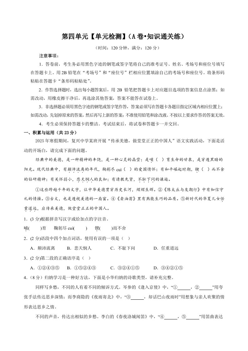第四单元(单元检测)(A卷•知识通关练)(学生版)(含答案)QXYWBB-023