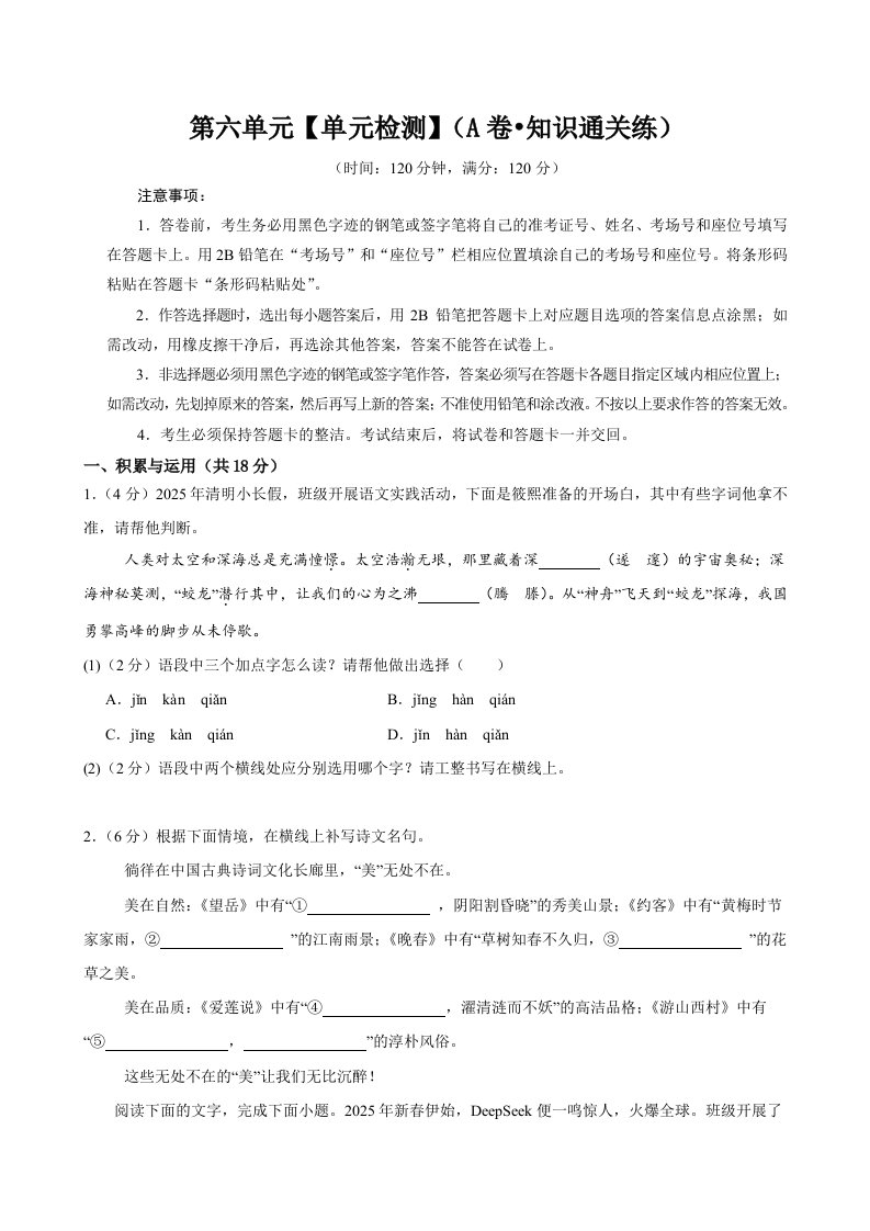 第六单元(单元检测)(A卷•知识通关练)(学生版)(含答案)QXYWBB-021
