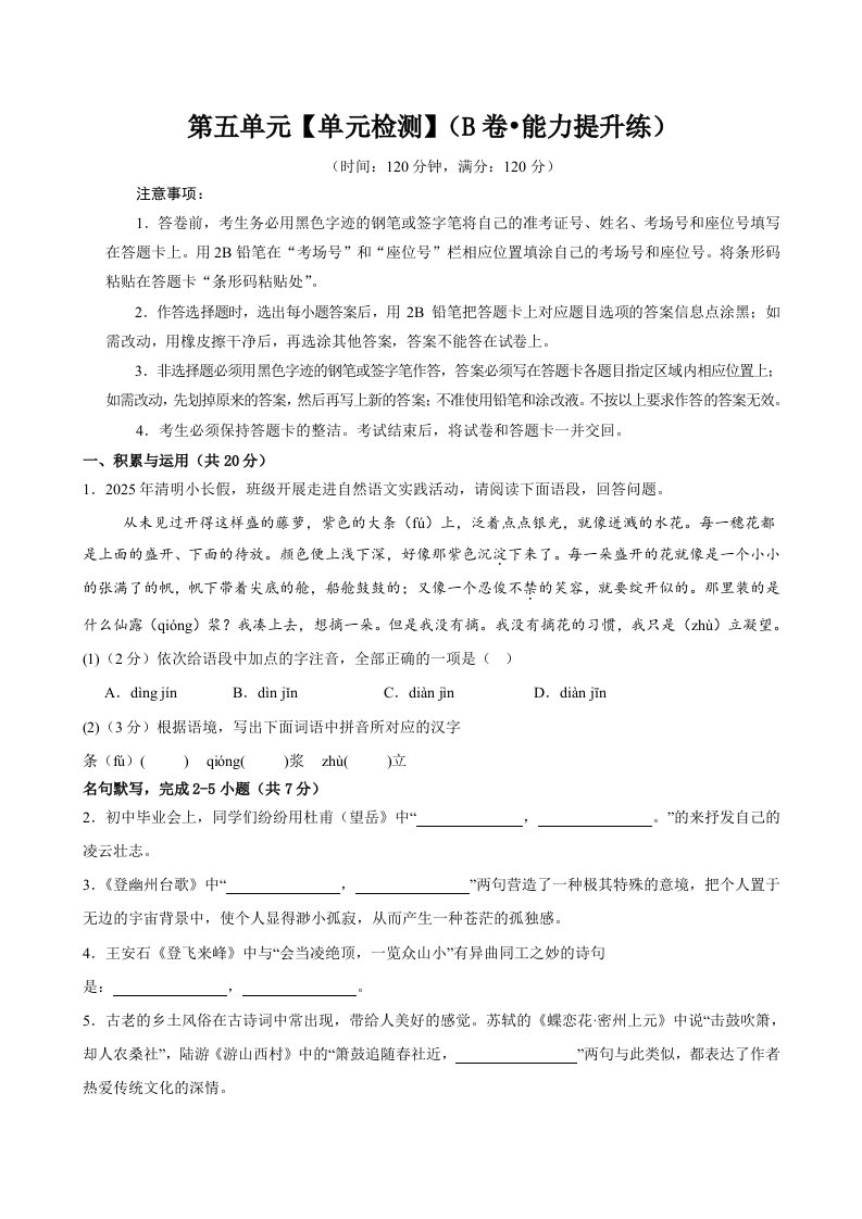 第五单元(单元检测)(B卷•能力提升练)(学生版)(含答案)QXYWBB-0132